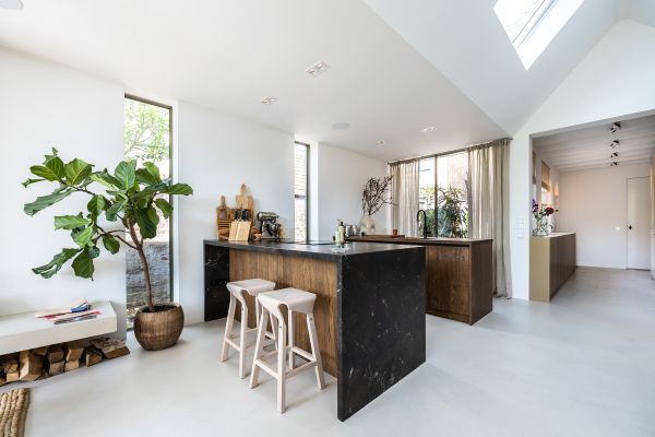 Een compact en charmant dorpshuis kreeg een uitbouw van 40m2, waardoor er een volwaardige woonkeuken gerealiseerd kon worden voor de bewoners die graag koken en gasten ontvangen. Een zichtbare connectie met het oude huis was belangrijk, evenals veel licht en zicht op de Vecht. Alle maatmeubilair is in nauw overleg met de bewoners ontworpen en evenals de gehele inrichting tot in de laatste details uitgevoerd.