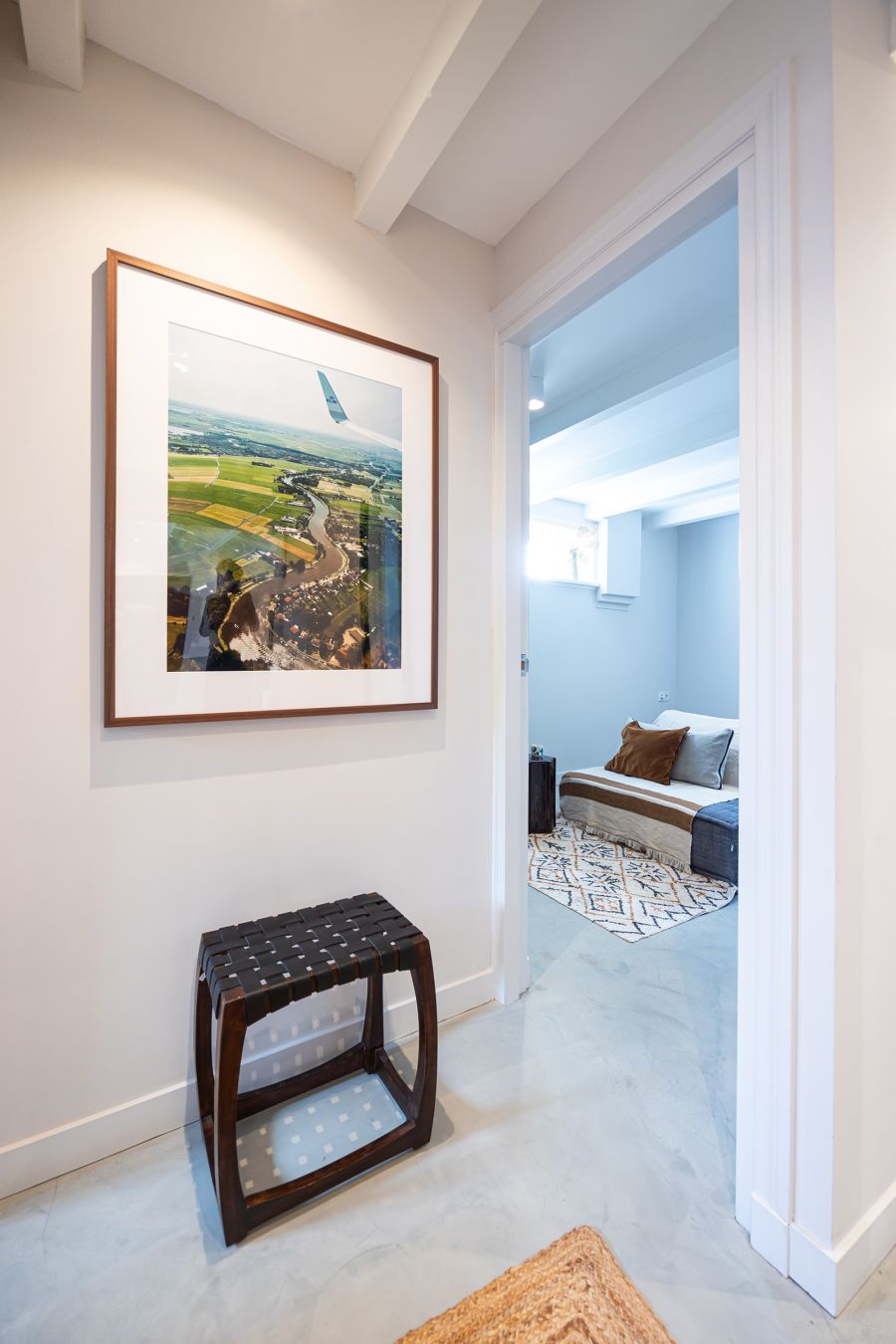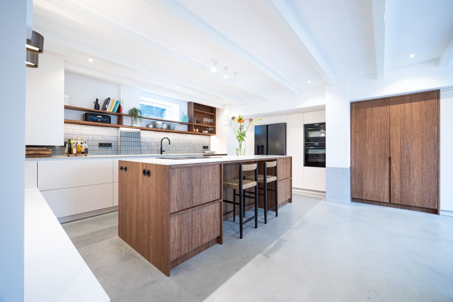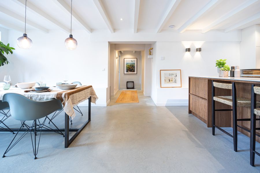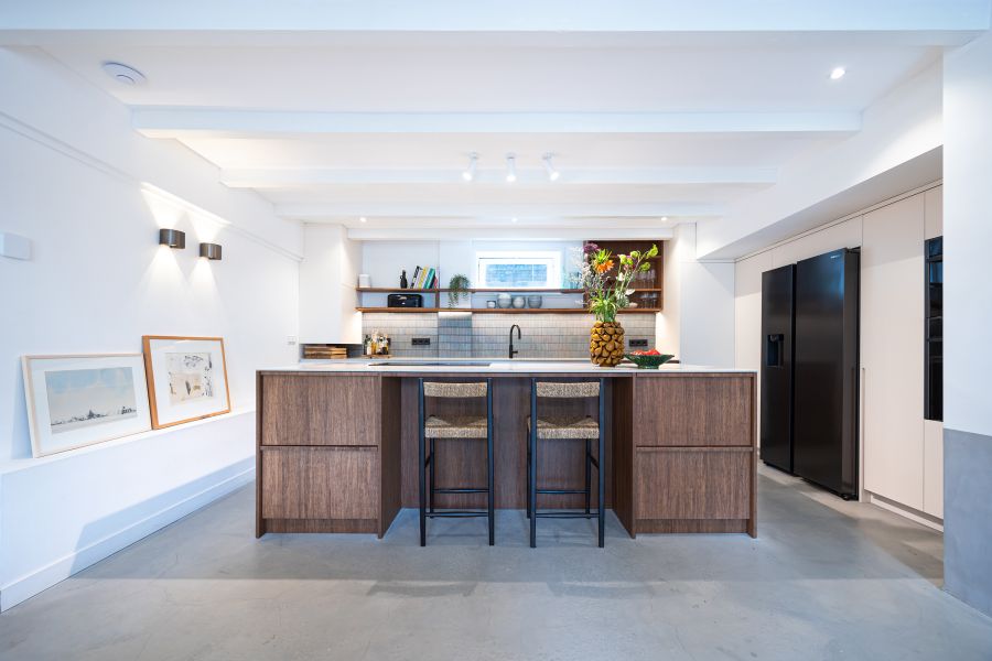 Dit bijzondere familiehuis aan de Amstel bestond oorspronkelijk uit 2 dijkhuisjes. De bewoners wilden in het souterrain een grote woonkeuken met connectie naar de tuin, wc, tv-kamer voor de kinderen en een badkamertje voor een douche na een duik in de Amstel. Een flinke verbouwing met geheel nieuwe indeling was nodig, ook om voldoende hoogte te creëren voor de nieuwe trap. BvB ontwierp het gehele renovatieplan, de keuken en het maatmeubilair en begeleidde de uitvoering.