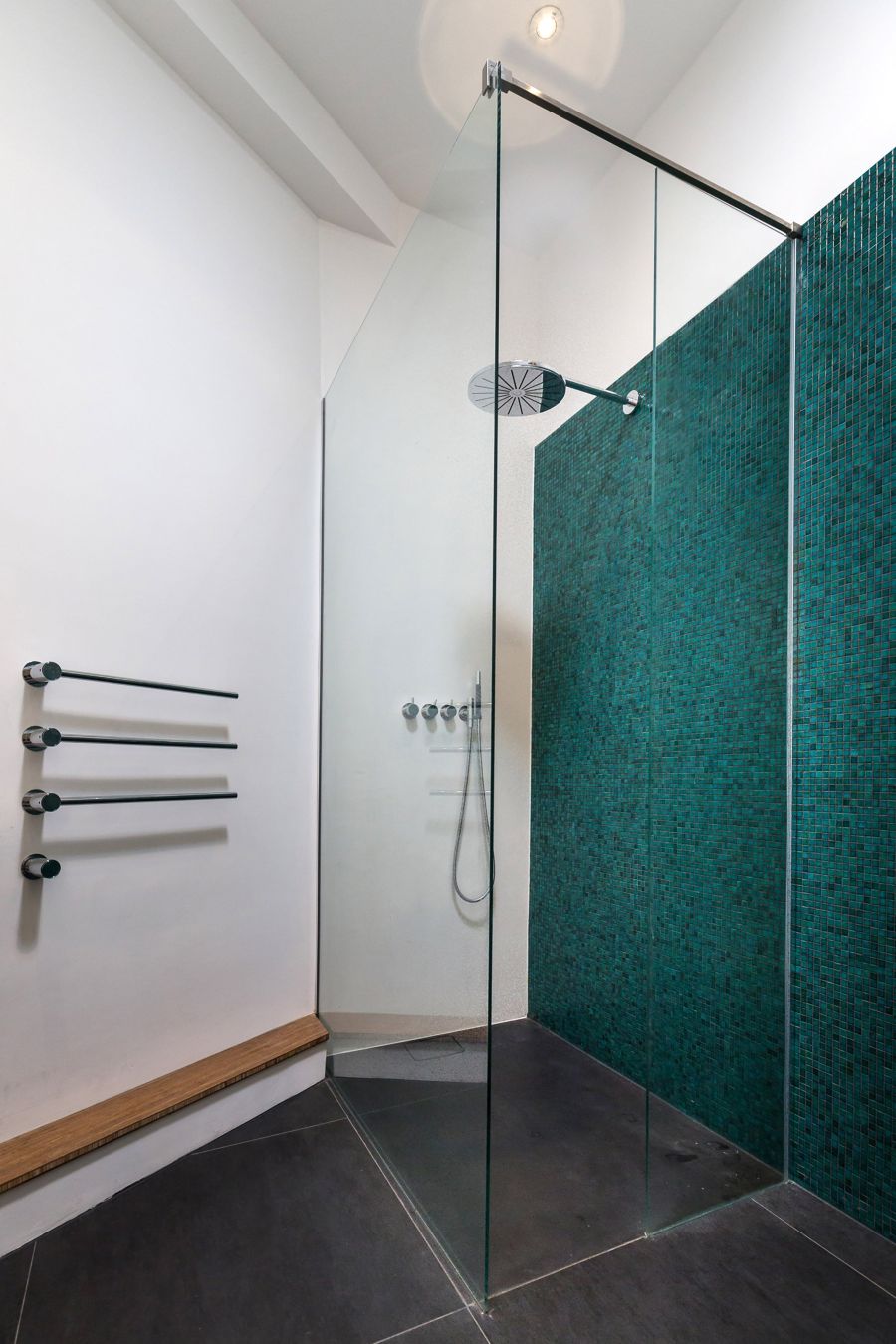 De zwevende treden tegen de achterwand leiden naar een kleine vide, voor extra slaapruimte en een trap naar het terras. De lichtstraat over de hele breedte geeft licht en ruimte achterin. Een deur in de achterwand van de loft leidt naar de slaapkamer met luxe badkamer.