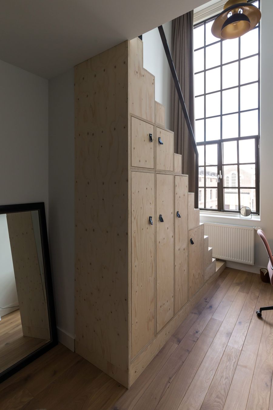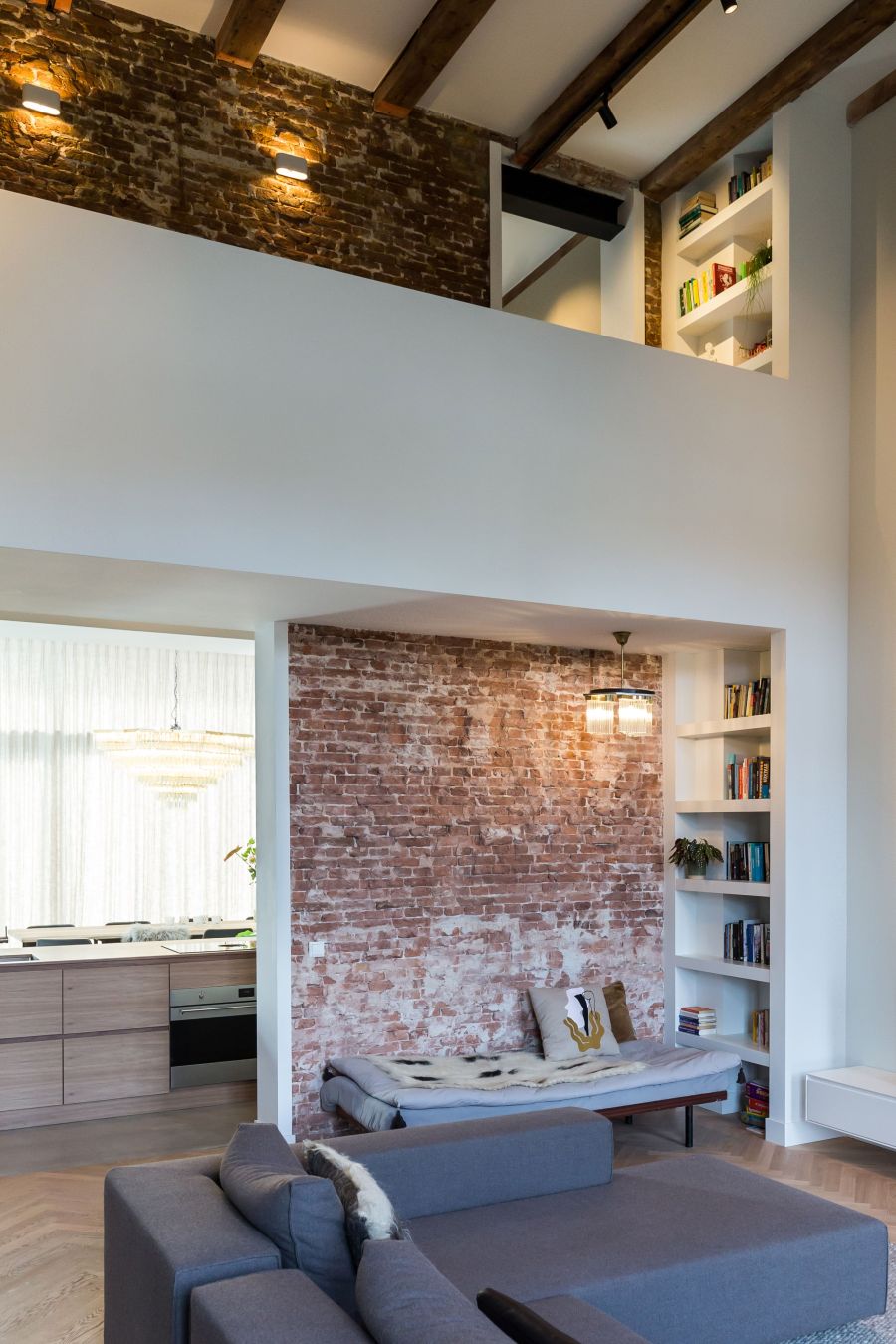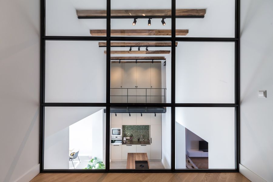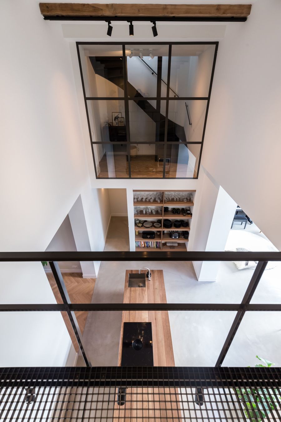 Ruimtelijk effect ontstaat door het gebruik van vides, trappen en glazen puien in combinatie met de plafonds van ruim 5,7 meter; zo staan de verschillende woonfuncties visueel met elkaar in verbinding.