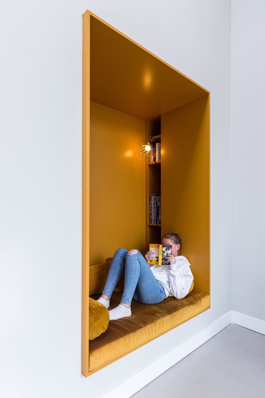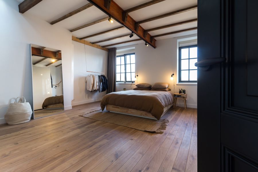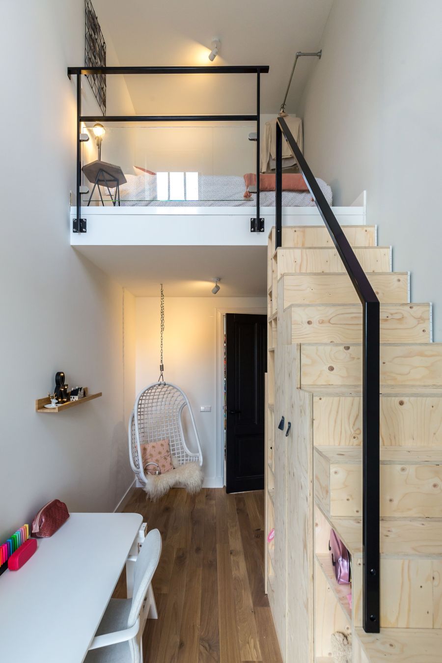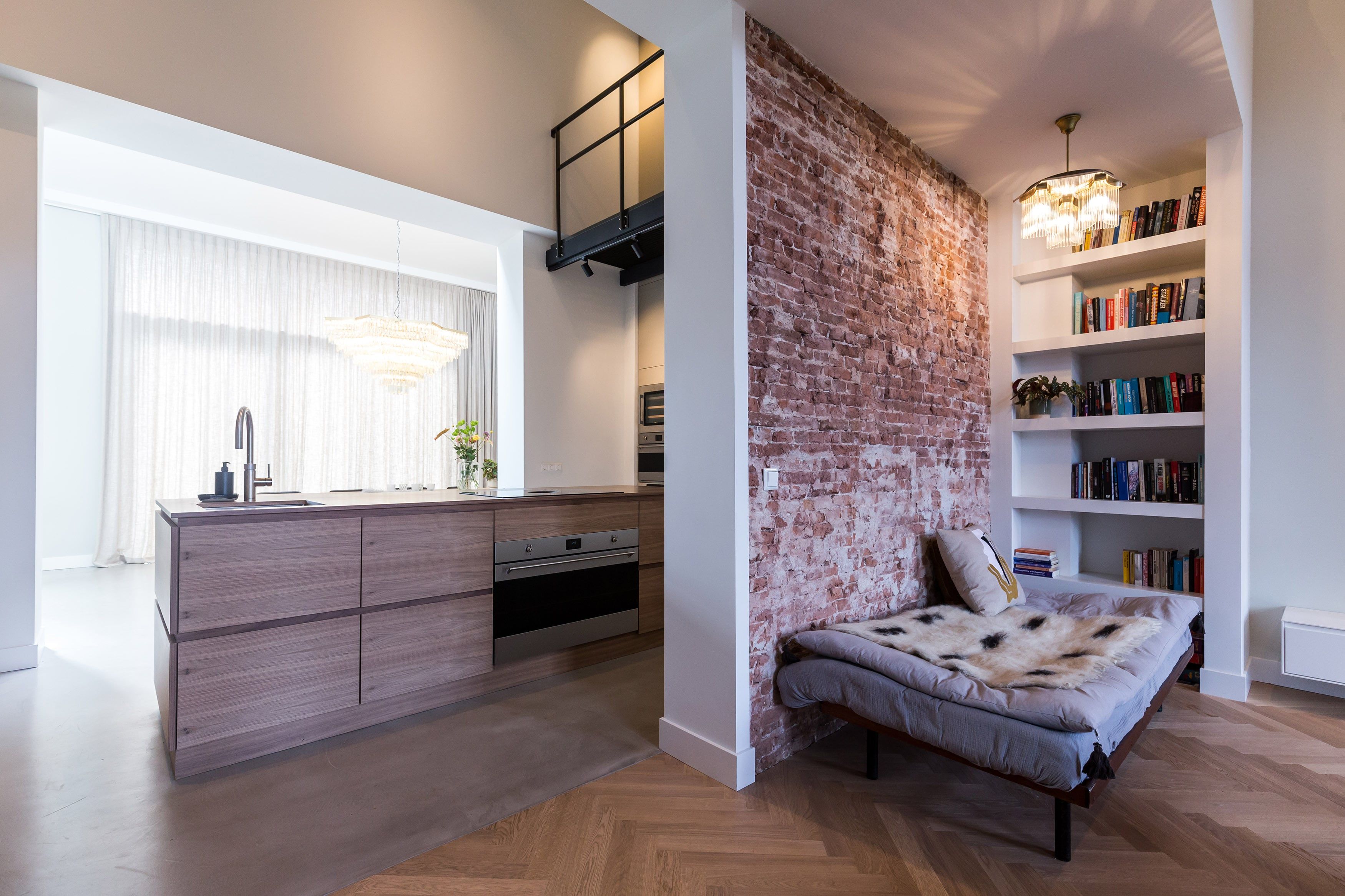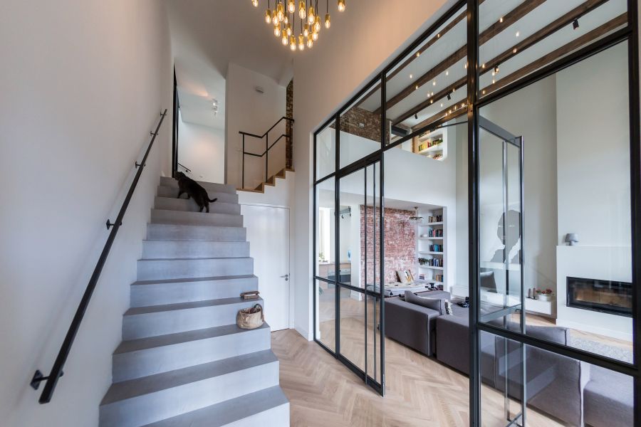 Ruimtelijk effect ontstaat door het gebruik van vides, trappen en glazen puien in combinatie met de plafonds van ruim 5,7 meter; zo staan de verschillende woonfuncties visueel met elkaar in verbinding.