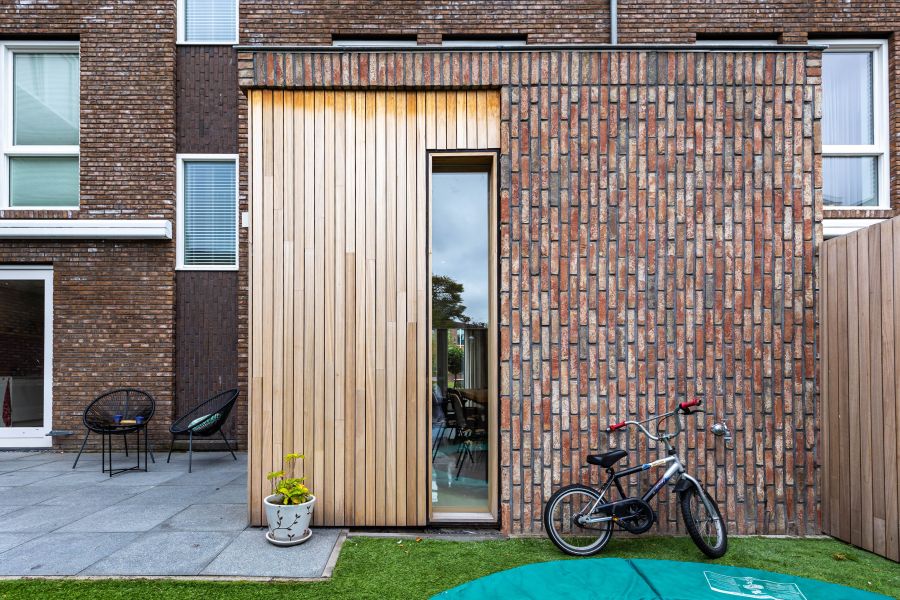 Bureau voor Binnen ontwierp een ranke uitbouw van ca 10 m2 in de bestaande baksteen met duurzaam Fraké hout; veel glas voor extra licht in de gehele woning. De bestaande pui met openslaande deuren werd teruggeplaatst. Maatmeubilair in de uitbouw, in de keuken en brede gang maakt verbinding tussen de ruimtes en geeft kleur en sfeer.